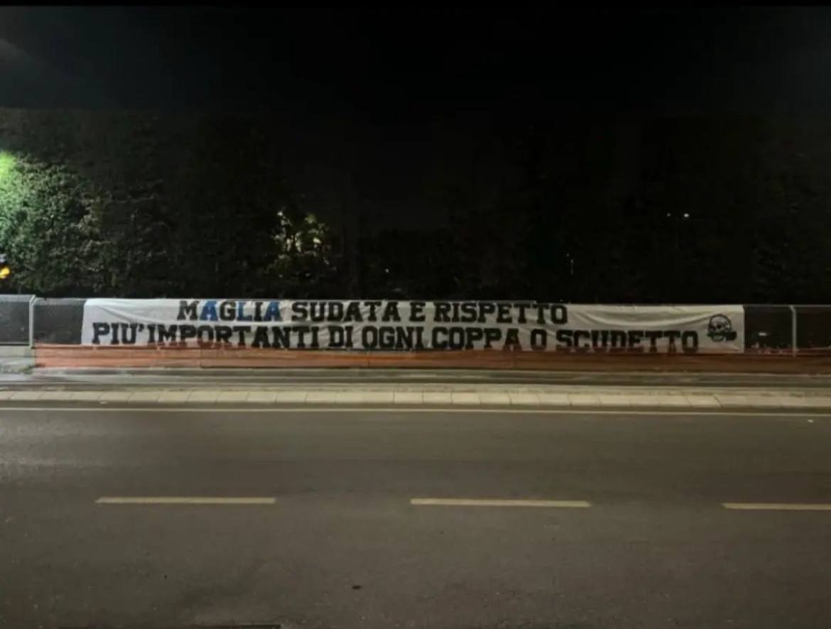 "Maglia sudata e rispetto più importanti di ogni coppa o scudetto" recita lo striscione appeso a Zingonia dai ragazzi della Curva Nord dell'Atalanta.