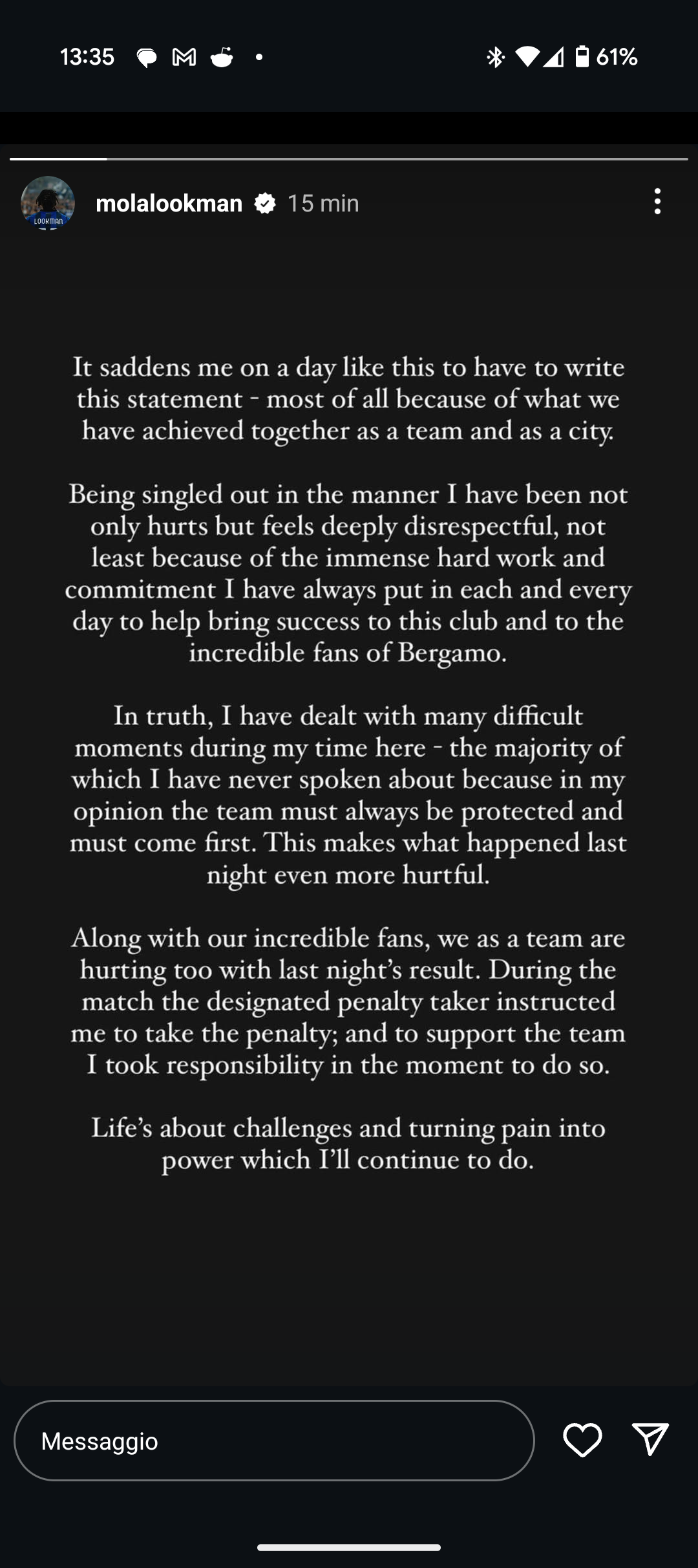 In una storia Instagram, Lookman decide di rispondere alle parole di Gasperini sul fatto che abbia battuto il rigore: