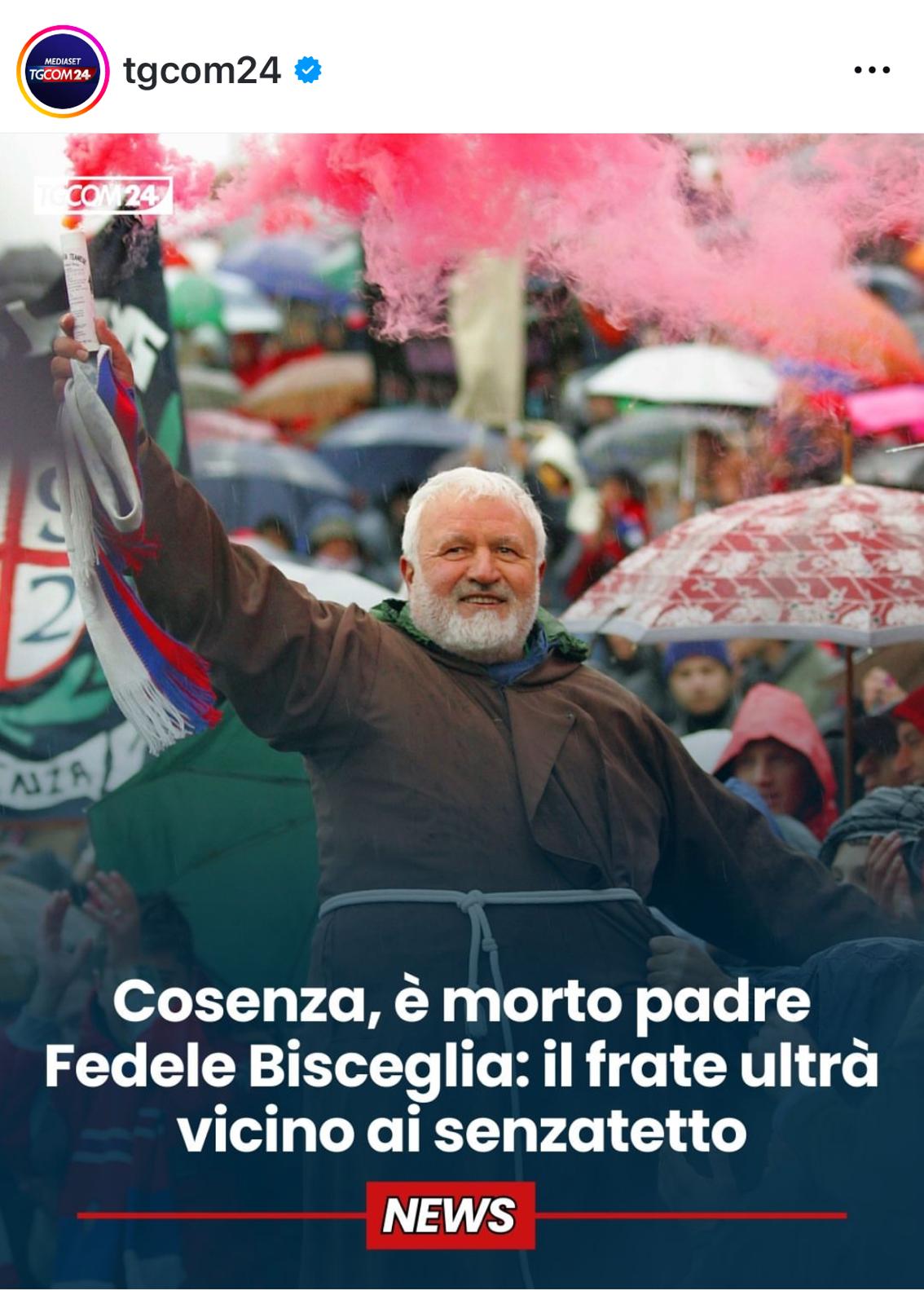 Ricoverato da settimane nel reparto di geriatria di una clinica alle porte di Cosenza, Padre Fedele Bisceglia si è spento all'età di 87 anni. Figura controversa e amatissima, ha rappresentato per decenni un punto di riferimento per i poveri e per i tifosi del Cosenza Calcio. Nonostante l'esclusione dalla vita ecclesiastica ufficiale in seguito a un'accusa poi rivelatasi infondata, non ha mai abbandonato il suo impegno verso gli ultimi. La sua morte ha suscitato cordoglio in tutta la città, tra messaggi commossi di politici, cittadini e associazioni.