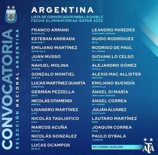 La Seleccion Albiceleste giochera' contro Cile e Colombia il 27 gennaio e 1 febbraio. Da notare l'assenza di Messi