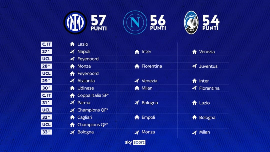 Nelle segrete stanze di Zingonia la squadra è uscita ancora più compattata e unita dalla precoce eliminazione dalla Champions. Spiazzati pure loro dalle frecciate a Lookman che Gasp ha derubricato a “battuta semi seria”, i giocatori si sono schierati dalla parte dell’eroe di Dublino, il cui ritorno dopo l’infortunio può far pendere la bilancia sul piatto dei bergamaschi nella corsa a tre per lo scudetto. Ancora più sorpresi dalle esternazioni del loro allenatore alla vigilia di Empoli (“Sicuramente non rinnoverò, vedremo a fine anno se sarà il caso di andare a scadenza o di andarmene”) i nerazzurri hanno 'sottoscritto' una sorta di patto per chiudere alla grande la stagione, trasformando l’uscita dall’Europa in un’occasione unica. Lottare per lo scudetto fino alla fine. Nonostante i contrasti e le ruggini, i propositi di allenatore e squadra convergono. Portare il tricolore a Bergamo riscriverebbe la geografia dello scudetto, oltre che la storia della Dea.