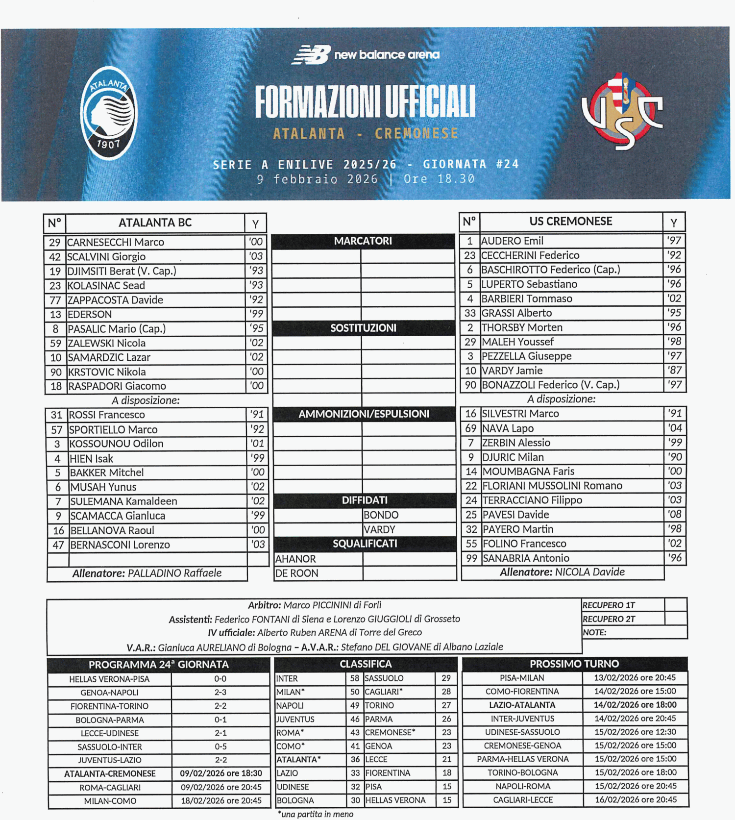 Durante il riscaldamento prepartita CDK ha accusato un risentimento muscolare (problema articolare al ginocchio destro) e dovra' rinunciare alla partita nonostante appaia nella formazione ufficiale, al suo posto Samardzic