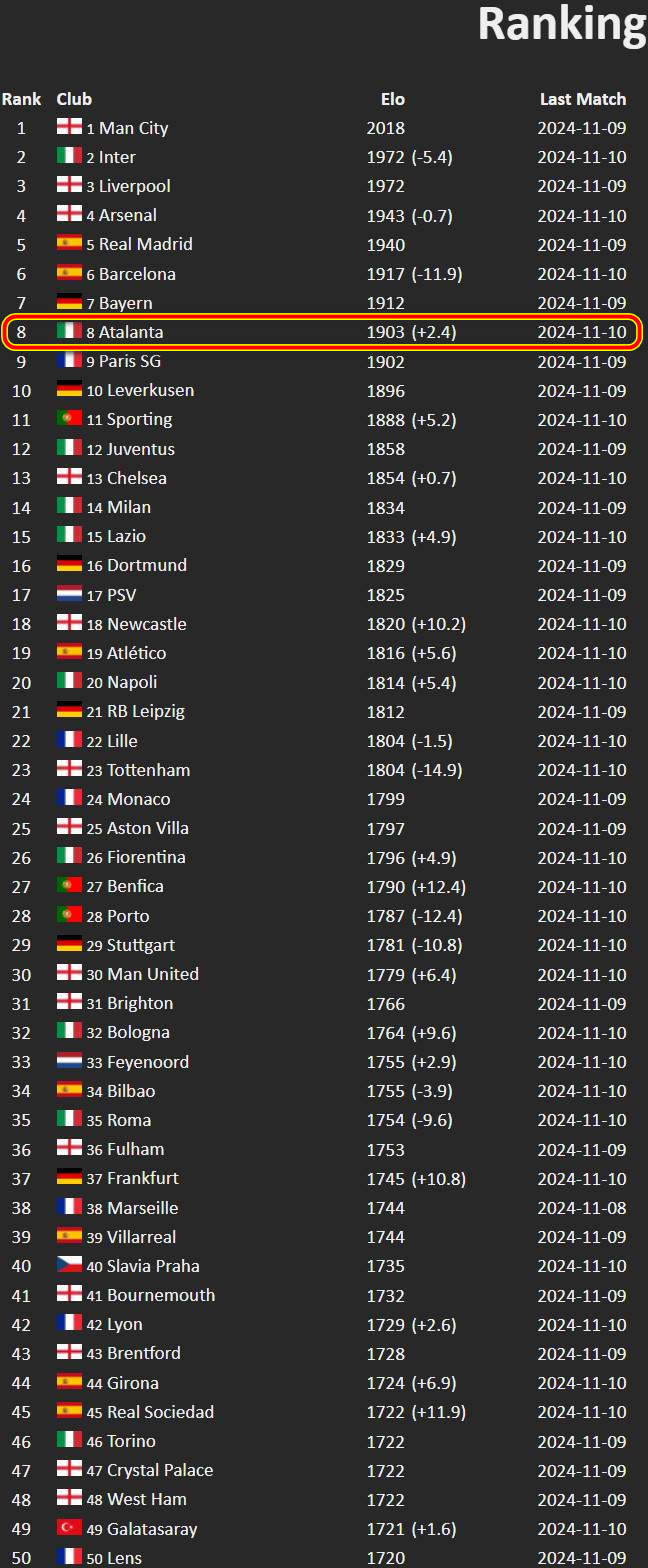 Ecco le prime 50 del ranking aggiornato, notare i soli 7 "pezzi da novanta" che abbiamo davanti. E' il gotha del calcio europeo e probabilmente mondiale...