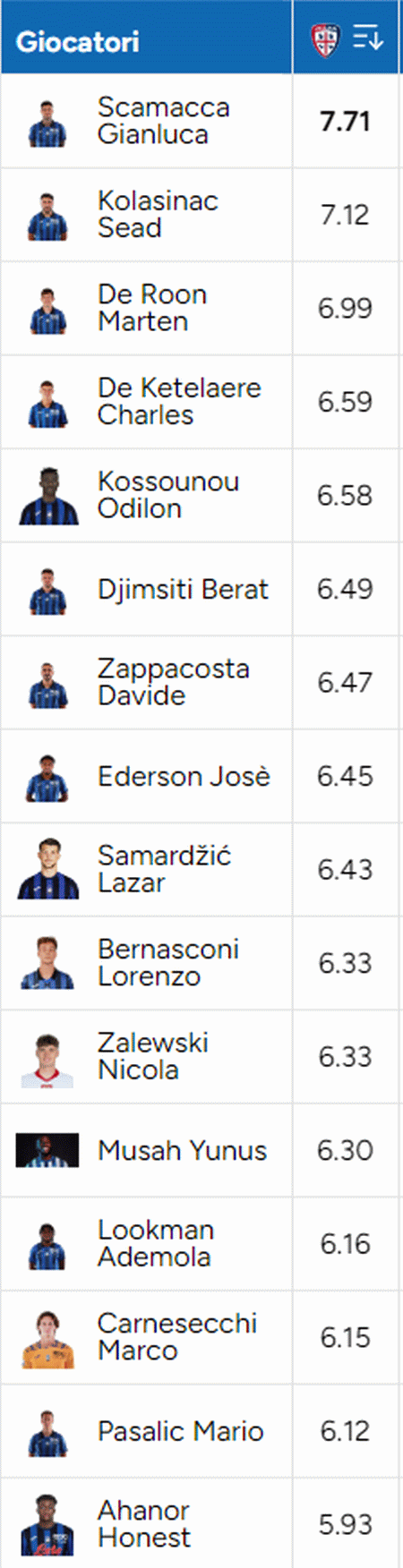 Cosi' com'era stato CDK a risultare nettamente il migliore contro il Chelsea, contro il Cagliari si e' imposto altrettanto nettamente Gianluca Scamacca nelle vostre valutazioni, riportando una media parecchio elevata di 7,71.