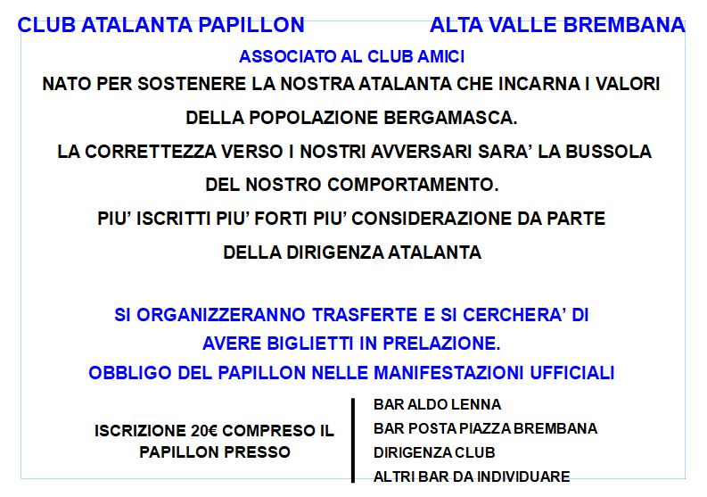 In questi giorni è nato un nuovo club di amici dell'Atalanta il PAPILLON ALTA VALLE BREMBANA , contraddistinto dall' obbligo di indossarlo in tutte le manifestazioni ufficiali ; siamo già in 70 e contiamo di superare i 100.Dando la notizia della nascita desideriamo anche sollecitarvi all'iscrizione. Si è scritto un canto propiziatorio dal titolo " L' anno che verrà " che vi sarà presentato nei prossimi giorni