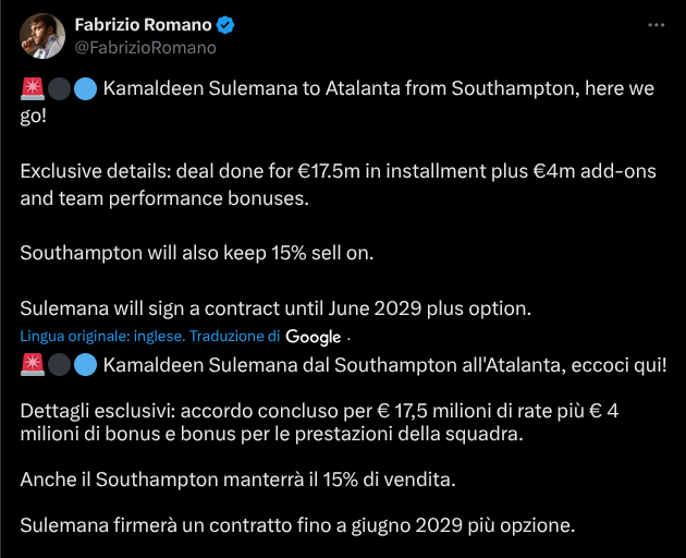 È fatta per l’arrivo di Kamaldeen Sulemana all’Atalanta: al Southampton andranno 17 milioni più 4 di bonus, e il 15% sulla futura rivendita