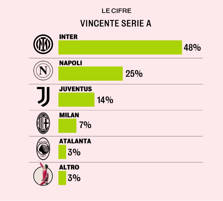 Secondo gli iscritti ad una community social dedicata a chi è alla ricerca di un’analisi degli eventi sportivi è l'Inter la favorita per lo scudetto, a seguire Napoli, Juventus e Milan. Ultima delle squadre citate singolarmente l'Atalanta con il 3%.
