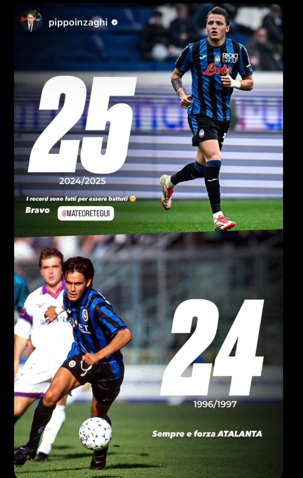 19/05/2025 | 20.30 40 Pippo Inzaghi si congratula con Retegui e sul suo Instagram scrive "Forza Atalanta" By staff