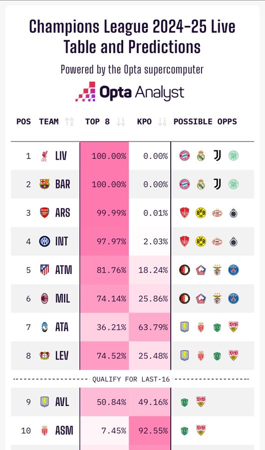 Per quanto ci riguarda ci danno il 36,21% di entrare nelle prime otto stasera, il 63,79% di fare i playoff dove, secondo i loro calcoli abbiamo la possibilita' di beccare una tra Aston Villa, Monaco, Sporting Lisbona e Stoccarda.