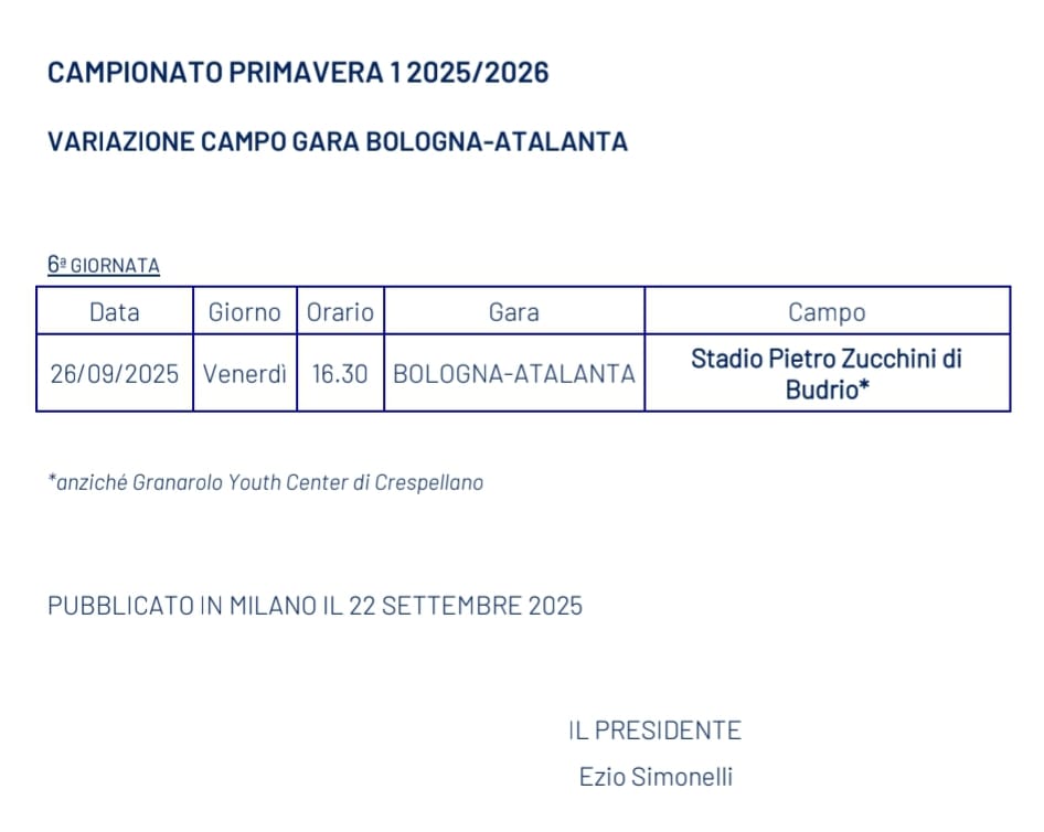 24/09/2025 | 13.45 0 Primavera: cambia il campo di gioco per la trasferta a Bologna Lo si apprende dal sito della Lega serie A: By sigo
