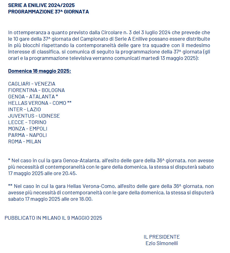 Qualora al termine della partita di lunedì sera l'Atalanta fosse in Champions matematicamente, allora a Genova si giocherà alle 20:45 del 17 maggio (sabato). In caso contrario, dovremo aspettare il comunicato della lega calcio (e nel caso, stando a quello che traspare dal documento, giocheremmo in contemporanea con le altre concorrenti).