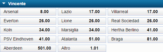 Premesso che siamo contro il gioco d'azzardo che ROVINA LE PERSONE E LE FAMIGLIE, vi pubblichiamo, a puro titolo di cronaca, le quotazioni attuali per il vincitore della prossima Europa League di uno dei piu' importanti e conosciuti bookmakers inglesi.