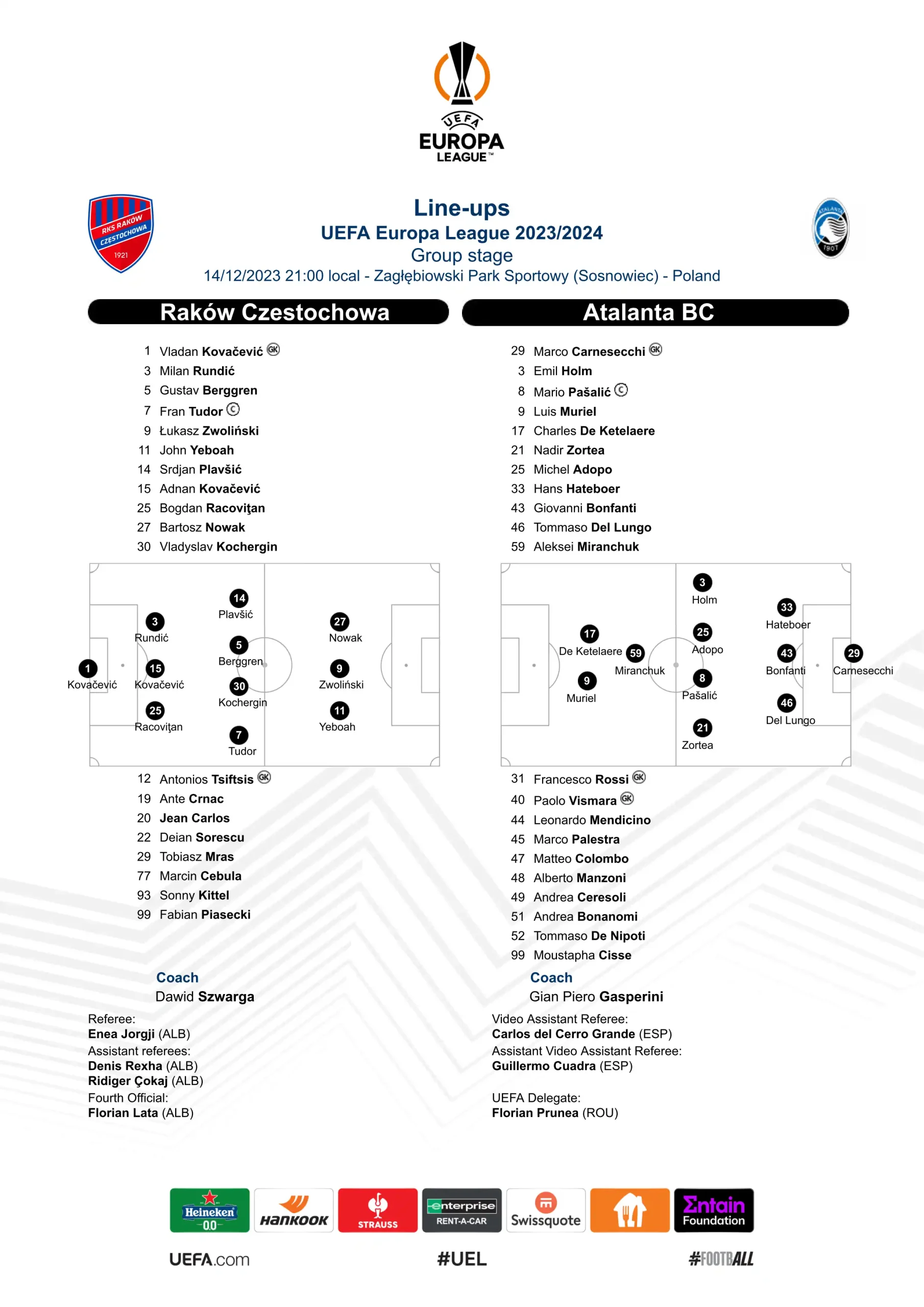 RAKOW (3-4-2-1): V. Kovacevic; A. Kovacevic, Racovitan, Rundic; Tudor, Kochergin, Berggren, Plavsic; Nowak, Yeboah; Zwolinski. All. Szwarga.