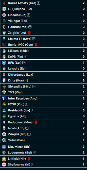 Le squadre qualificate hanno una freccia rivolta in alto alla fine del nome