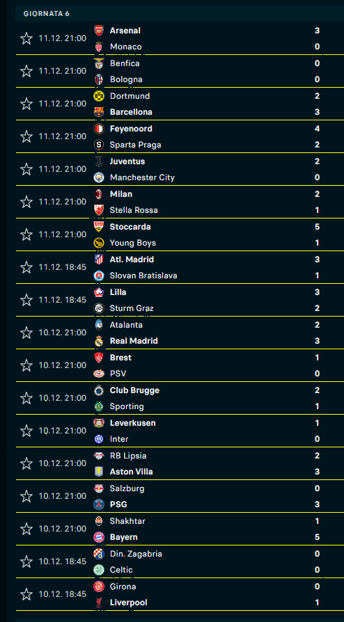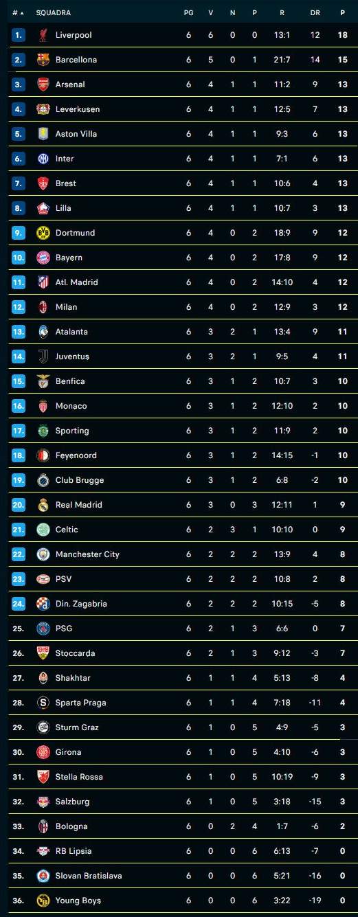 Risultati e classifica dopo 6 turni di CL. Siamo 13mi