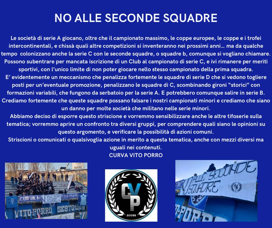Le società di serie A giocano, oltre che il campionato massimo, le coppe europee, le coppe e i trofei intercontinentali, e chissà quali altre competizioni si inventeranno nei prossimi anni... ma da qualche tempo colonizzano anche la serie C con le seconde squadre, o squadre b, comunque si vogliano chiamare. Possono subentrare per mancata iscrizione di un Club al campionato di serie C, e ivi rimanere per meriti sportivi, con runico limite di non poter giocare nello stesso campionato della prima squadra. E' evidentemente un meccanismo che penalizza fortemente le squadre di serie D che si vedono togliere posti per un'eventuale promozione, penalizzano le squadre di C, scombinando gironi "storici" con formazioni variabili, che fungono da serbatoio per la serie A. E potrebbero comunque salire in serie B. Crediamo fortemente che queste squadre possano falsare i nostri campionati minori e crediamo che siano un danno per molte società che militano nelle serie minori. Abbiamo deciso di esporre questo striscione e vorremmo sensibilizzare anche le altre tifoserie sulla tematica; vorremmo aprire un confronto tra diversi gruppi, per comprendere quali siano le opinioni su questo argomento, e verificare la possibilità di azioni comuni. Striscioni o comunicati o qualsivoglia azione in merito a questa tematica, anche con mezzi diversi ma uguali nei contenuti. CURVA VITO PORRO