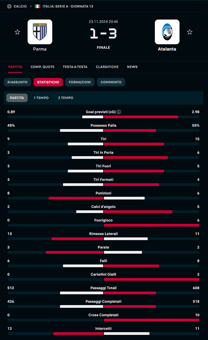 - settima vittoria di fila sul Parma comprese le partite giocate a Bergamo, ultima sconfitta per 4-0 nel 2014