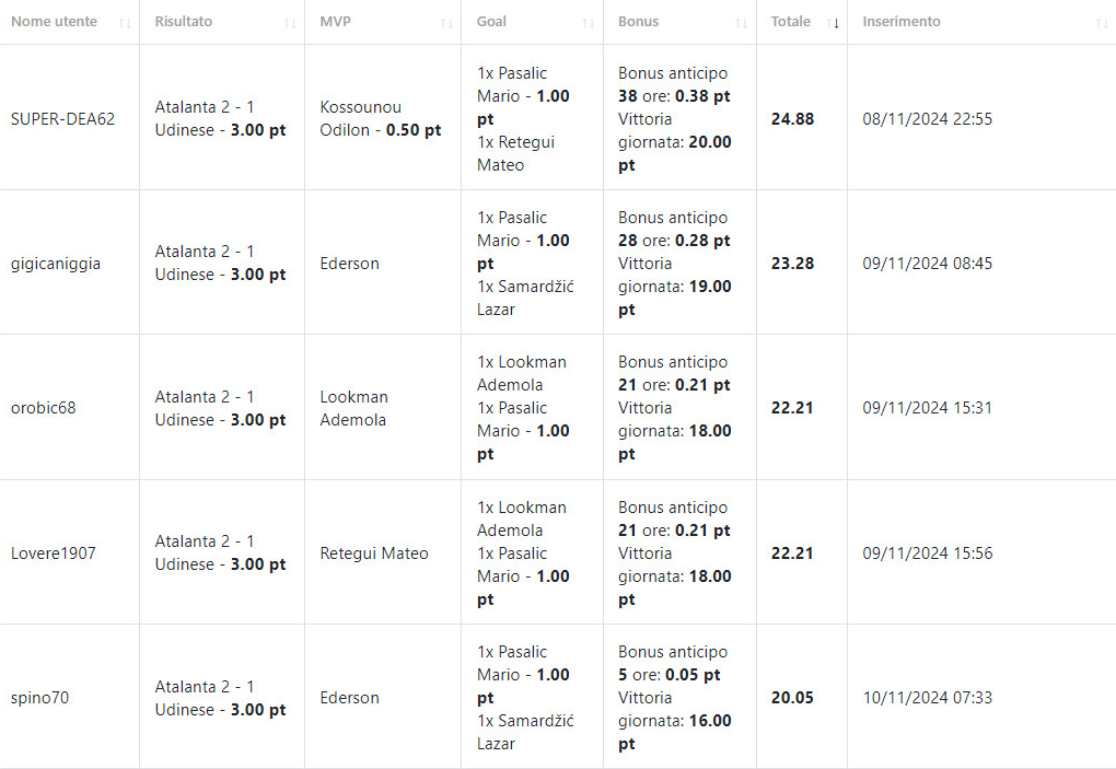TotoDea, classifica di tappa e generale dopo l'Udinese