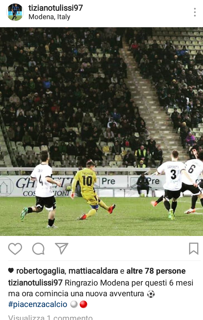 „Bel colpo di mercato del Piacenza che, nonostante le dichiarazioni di rito, è ancora vigile sulla finestra invernale. Il presidente Marco Gatti ha confermato poco fa l’ingaggio del giovane esterno offensivo classe ’97, Tiziano Tulissi, di proprietà dell’Atalanta ma in prestito al Modena in questa prima parte della stagione. Giocatore di vent’anni può svariare su tutto il fronte di attacco anche se gioca in prevalenza a destra e con il Modena ha collezionato comunque 19 presenze in Lega Pro. Il suo arrivo completa ora la rosa in attacco che dispone di due soluzioni per ogni ruolo, sfuma quasi definitivamente invece la possibilità di arrivare a Mattia Sprocati, il giocatore della Pro Vercelli sembra molto vicino alla Salernitana.“