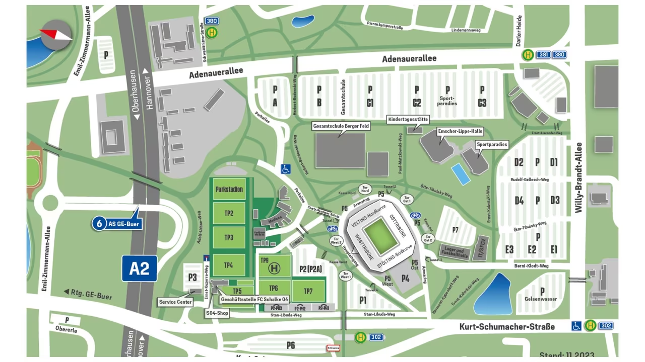 I parcheggi ospiti per auto e autobus sono raggiungibili tramite Berni-Klodt-Weg (https://www.google.de/maps/place/Berni-Klodt-Weg,+45891+Gelsenkirchen/@51.5501488,7.0661829,17z/data=!3m1!4b1!4m5!3m4!1s0x47b8e60b7d80a52f:0x8efc5c3b36696bfb!8m2!3d51.5501488!4d7.0683716?shorturl=1).