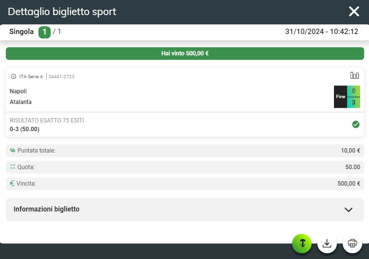sono al settimo cielo, certo perchè ha vinto la Dea ma anche per un secondo motivo ,è la seconda volta nella mia vita che scommetto e guardate che doppio regalo mi ha fatto la nostra magica Dea, certo l'importante era vincere ma alla fine del primo tempo ho sperato anche in questo ed il nostro centravanti alla fine mi ha dato una seconda gioia, ancora non ci credo.Se decidete di pubblicare qualcosa in merito, questa volta preferirei restare anonimo, altrimenti devo pagare da bere a tutti
