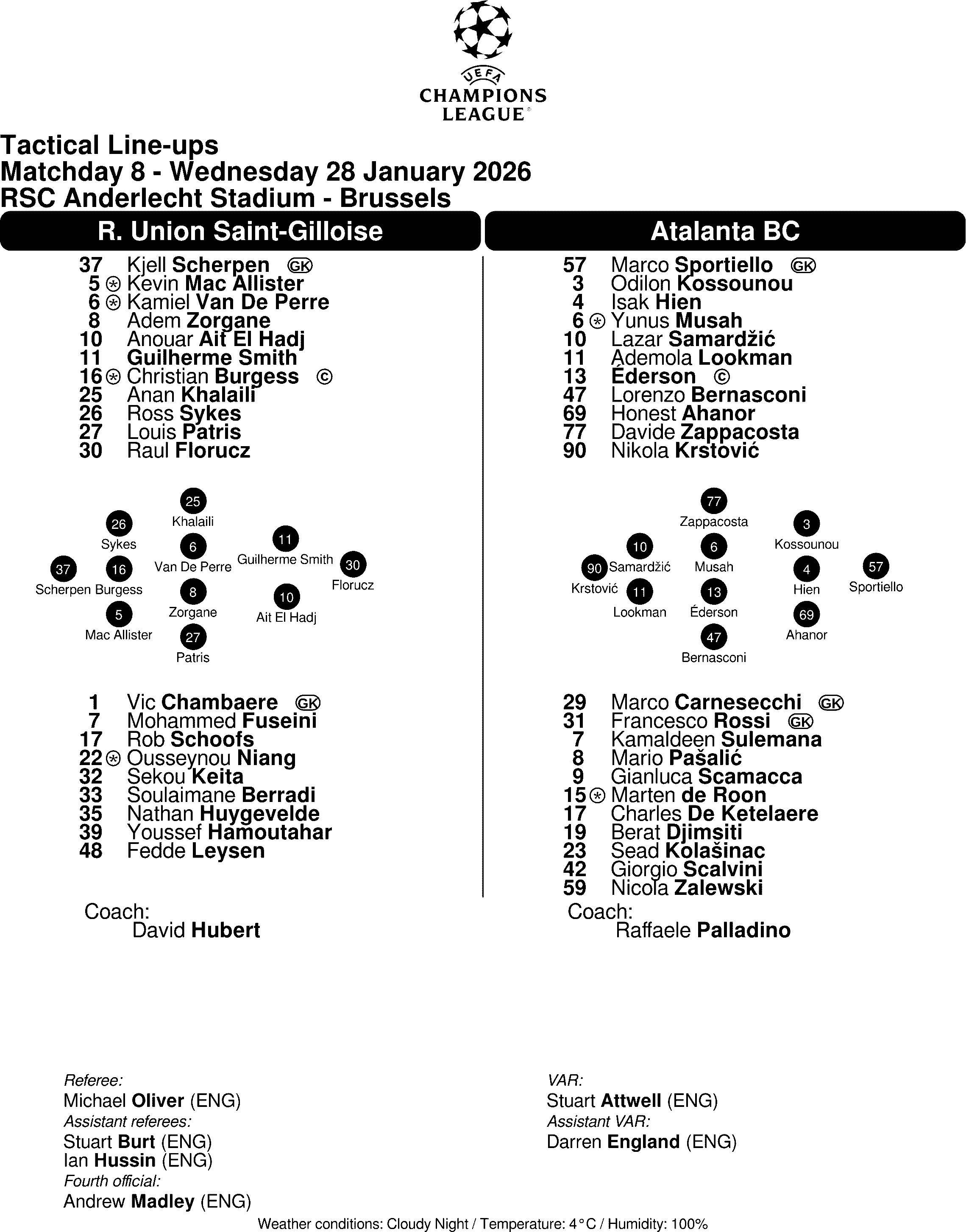Union Saint-Gilloise: Scherpen, Mac Allister, Burgess, Sykes, Patris, Zorgane, Van de Perre, Khalaili, El Hadj, Guilherme Smith, Florucz. A disposizione: Chambaere, Fuseini, Schoofs, Niang, Keita, Berradi, Huygevelde, Hamoutahar, Leysen. Allenatore: David Hubert.